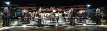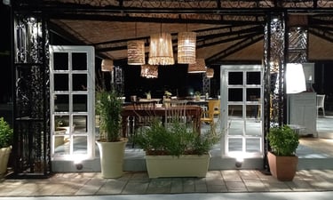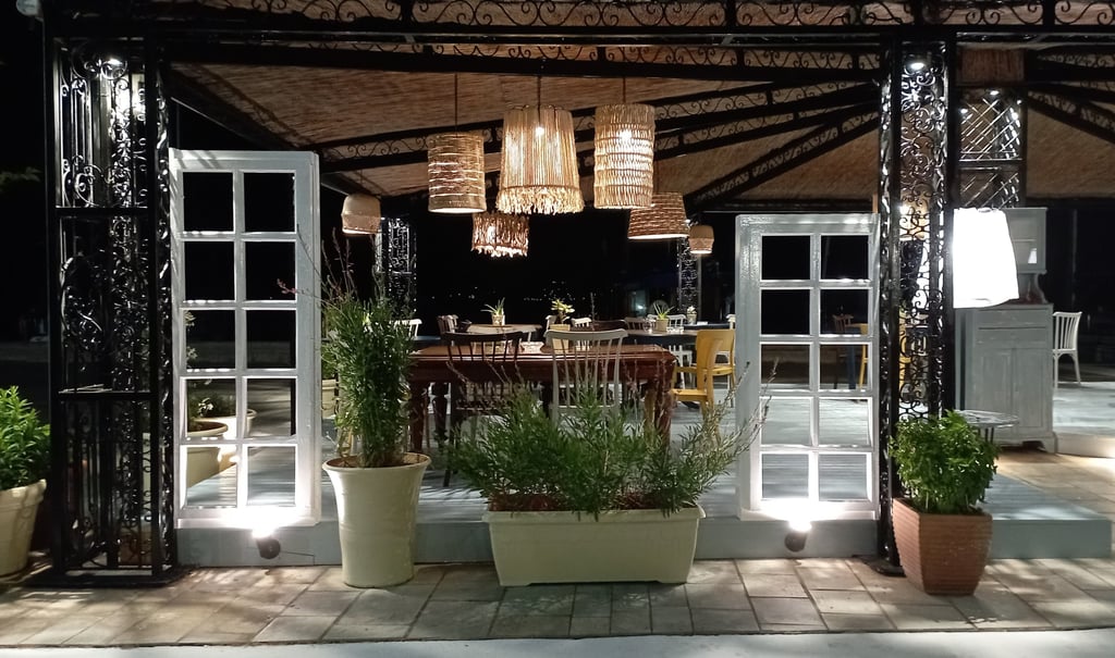 We have created layers of light by placing architectural lighting that flatters the wrought iron structure and pendant lights made of rope or driftwood above the dining tables. The driftwood have been collected at the nearby beaches and the rope shades are hand-woven.