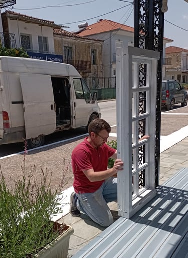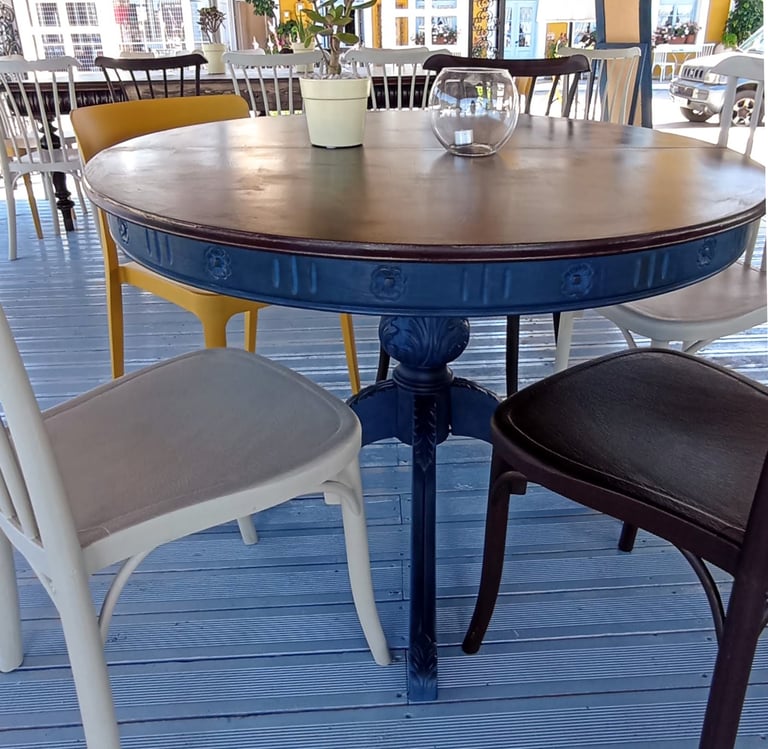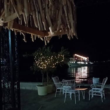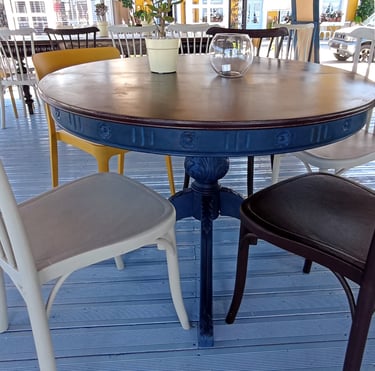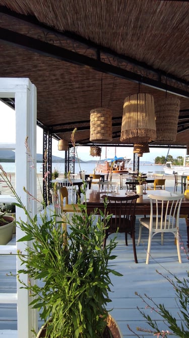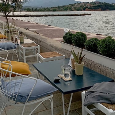 The renovated summer restaurant space expands below the existing metal structure, at the promenade of Achillio bay. We have applied a contemporary classic style, always respecting our philosophy of sustainable design. The dominant elements are the vintage dining tables, that have been refurbished using contemporary hand-painting techniques.